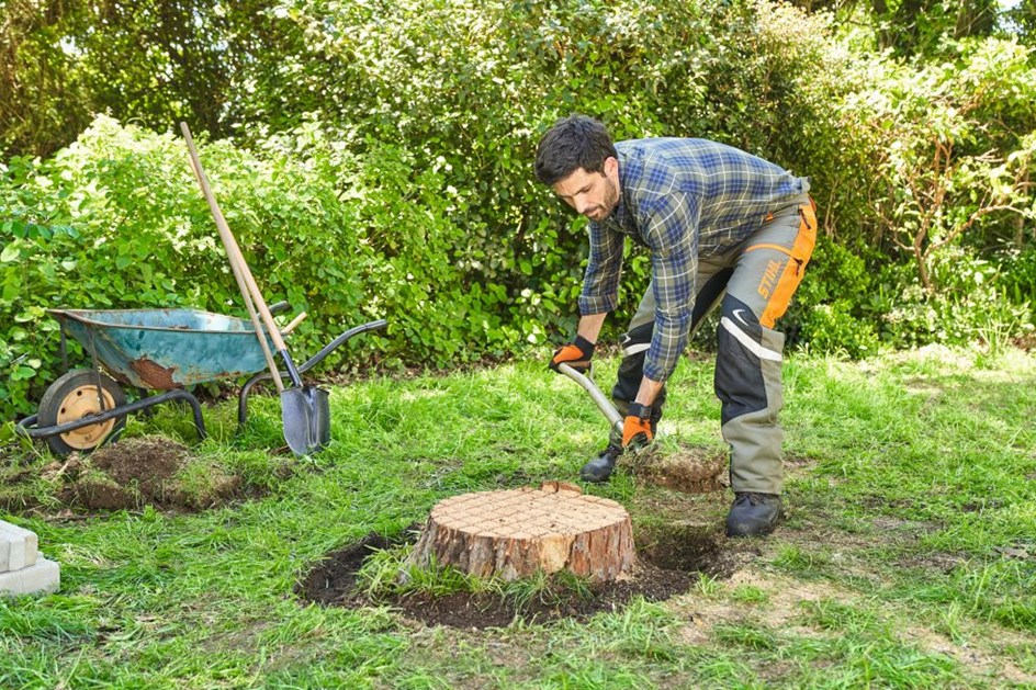 Želite li panj ukloniti kopanjem, idealno je suho vrijeme jer se vlažna zemlja lijepi za vrtni alat i otežava rad. Osobito kod biljaka s dubokim korijenom, trebali biste planirati više vremena za uklanjanje korijena stabla. Sklopiva pila STIHL ili lopata i sjekira prikladni su za vađenje korijena stabla.