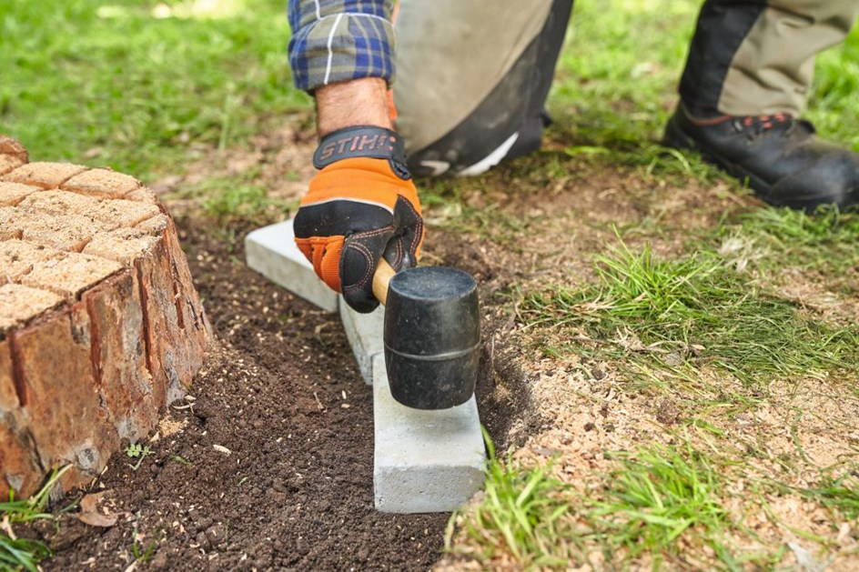 Odložite lopatu i uzmite kamenje iz kolica koje poredajte u jarak oko panja. Koristili smo klinker opeke od terakote otporne na vremenske uvjete. Lagano udarite kamenje u donjem redu u tlo, a zatim labavo postavite sve kamenje u ostale redove.