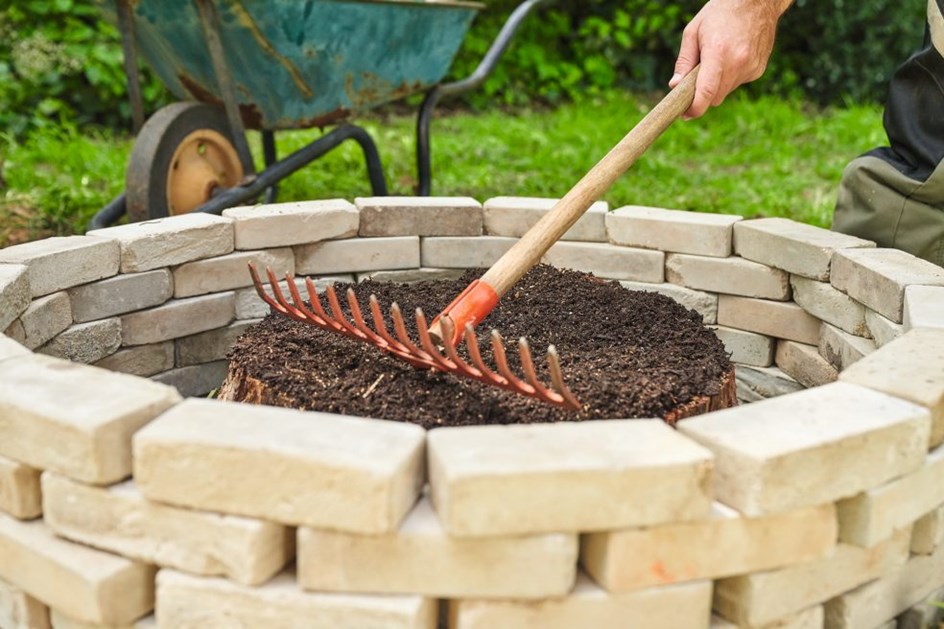Sada lopatom bacite obogaćeni kompost na panj i stražnjom stranom grablji pažljivo utrljajte kompost u utore. Ovisno o veličini preostalog panja, to je oko 20 litara. Temeljito istucite kompost stražnjom stranom grablji, a zatim zalijte kantom za zalijevanje. Također, istucite zemlju sa uklonjenih busena oko kamenja i temeljito utabajte.